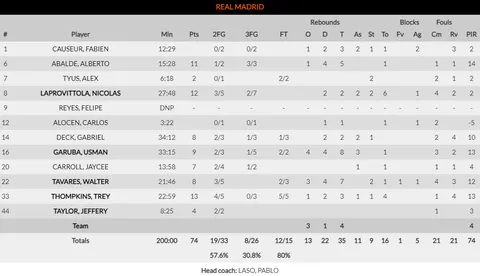 3/3 en triples y 14 de valoración gracias a sus 11 puntos y 5 rebotes. Otro partido que Abalde no va a olvidar. Un triple que puede valer un billete para el Top-8. El gallego quiso sumarse a un partido donde Garuba y Laprovittola sostuvieron al equipo, pero en el momento de la verdad. Abalde demostró que vale por un MVP.