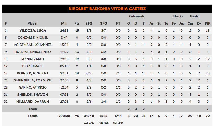 2. Hace falta algo más que Poirier y Janning. Poirier, MVP del partido con 18 puntos, 10 rebotes, 2 asistencias y 30 de valoración, se dejó las garras en la pista. Fue el mejor sin duda de este Baskonia que necesita algo más. Janning volvió a su mejor nivel, 18 puntos (4 triples). Pero los de Perasovic necesitan más puntos y más pelea en defensa si quieren hacer algo en Europa. Habrá que esperar a que comienza la resurreción Perasovic en Euroliga.