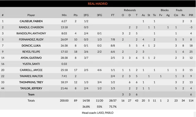 2. El control del rebote vuelve a ser síntoma de victoria. Si en el primer partido fueron los "tréboles" quienes se llevaron la lucha por 38-26, esta vez fue el Real Madrid más contundente todavía, con un 24-43. Laso optó por sentar a Tavares y Randolph en la segunda mitad y dejar todos los minutos para Reyes, Ayón y Thompkins, que cerraron muy bien el rebote a jugadores como Payne (3), Gist (2) y Antetokounmpo (0). Incluso Doncic se llevó el duelo individual ante un base muy reboteador como Calathes. Los números no mienten y ambos equipos tendrán que tenerlo en cuenta de cara a los dos partidos que quedan en Madrid.