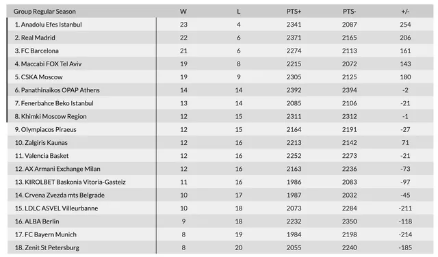 Viendo las primeras plazas de la clasificación, vuelven a estar copadas por los megaproyectos de Barcelona, Madrid, CSKA y Efes. Pero el foco de atención ahora mismo parece estar en la lucha encarnizada por la séptima y octava plaza por la que pujan los citados Fenerbahce y Milan así como Khimki, Valencia Basket, Zalguiris y Olimpiakos.