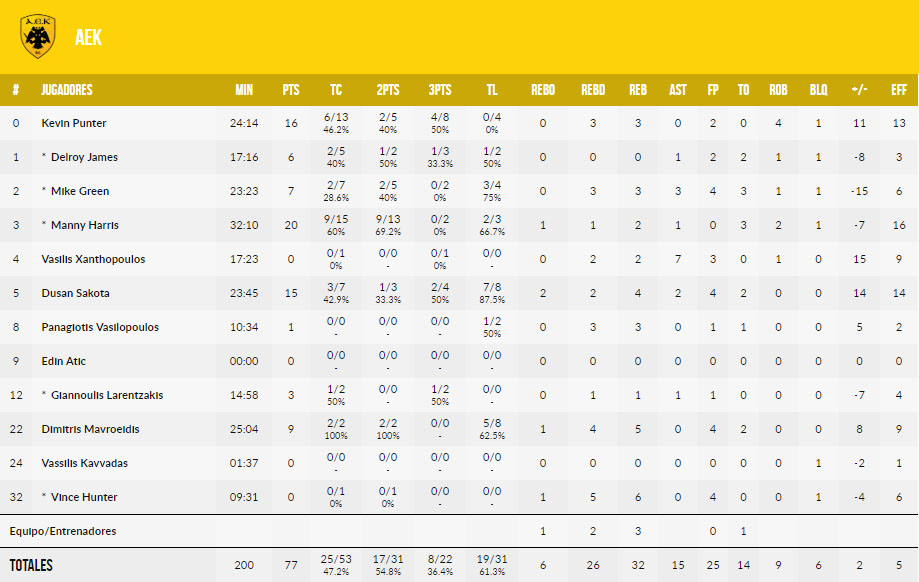 El ‘Big Three’ de AEK: entre Kevin Punter (16), Manny Harris (20) y Dušan Šakota (15) anotaron 51 de los 77 puntos de su equipo. En algunos momentos se mostraron intratables, sobre todo Harris que terminó el partido con un 69’2% en tiros de dos (9/13). Un porcentaje demasiado alto para un exterior con ese volumen de tiros.