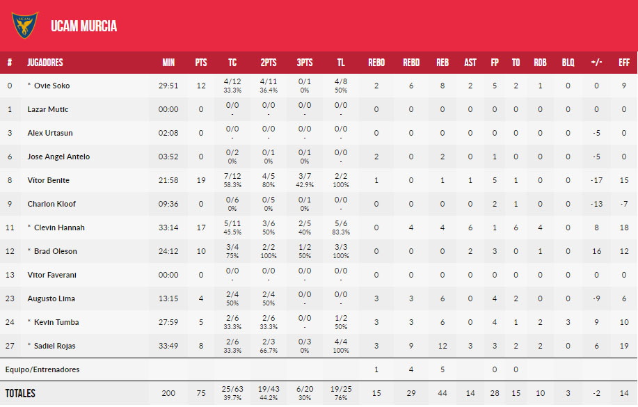 El juego interior murciano: pese a dominar el rebote y tener, a priori, ventaja en el juego interior el UCAM Murcia no supo plasmarlo en el partido. En rebotes la diferencia fue clara, 32-44 a favor de los universitarios; pero no lo aprovecharon como deberían haberlo hecho. En puntos en la pintura tan solo dos más para los de Ibon Navarro: 30-32. Soko, que terminó con buenos números (12 puntos y 8 rebotes), acabó eliminado por faltas y tuvo muy malos porcentajes (4/12 TC). Tampoco estuvo a la altura Lima que jugó solo 13 minutos, en los que aportó 4 puntos y 6 rebotes.