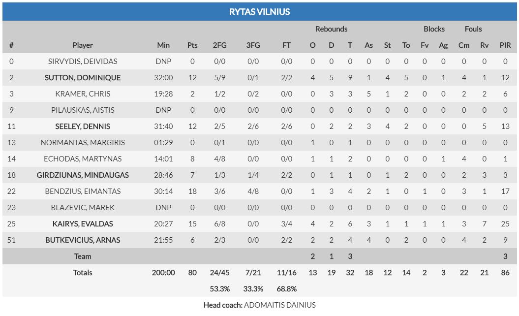 EL RYTAS REBOTEÓ Y TIRÓ MUCHO MÁS. La estadística lo dice claro. Los lituanos cogieron diez rebotes más (32 a 23), y por consiguiente tiraron mucho más a canasta (66 tiros de campo por 47 de Unicaja). Quizá aprovechando el cansancio acumulado del Unicaja por su tortuosa llegada a Vilna, los Sutton, Bendzius o Kairys se mostraron siempre muy activos, y aprovecharon su momento de mayor acierto, en el último cuarto, para pegar un estirón definitivo (del 54-55 al 78-65). Su ritmo ofensivo fue mucho mayor que el del Unicaja, que trató de plantear un partido más lento, y al final no le salió bien.