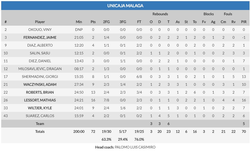 POCOS ARGUMENTOS OFENSIVOS. Muchos jugadores de Unicaja fueron una sombra de lo que mostraron el viernes pasado ante el Valencia, especialmente en ataque. La pareja formada por Alberto Díaz y Jaime Fernández se quedó en 6 puntos entre ambos, mientras que Salin anotó apenas dos tiros libres. Realmente, del juego exterior solo Brian Roberts acabó con buenos números (13 puntos), si bien estos llegaron en su mayoría en el tramo final del partido, cuando el Lietuvos había alcanzado una renta casi definitiva. Lessort, con 16 puntos, fue el jugador más destacado del equipo, mientras que Shermadini hizo daño en la pintura, si bien su participación pudo haber sido mayor (8 puntos en 15 minutos).