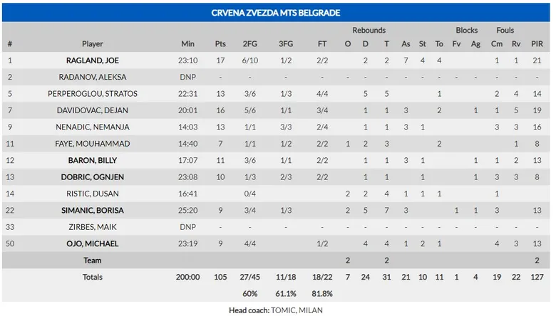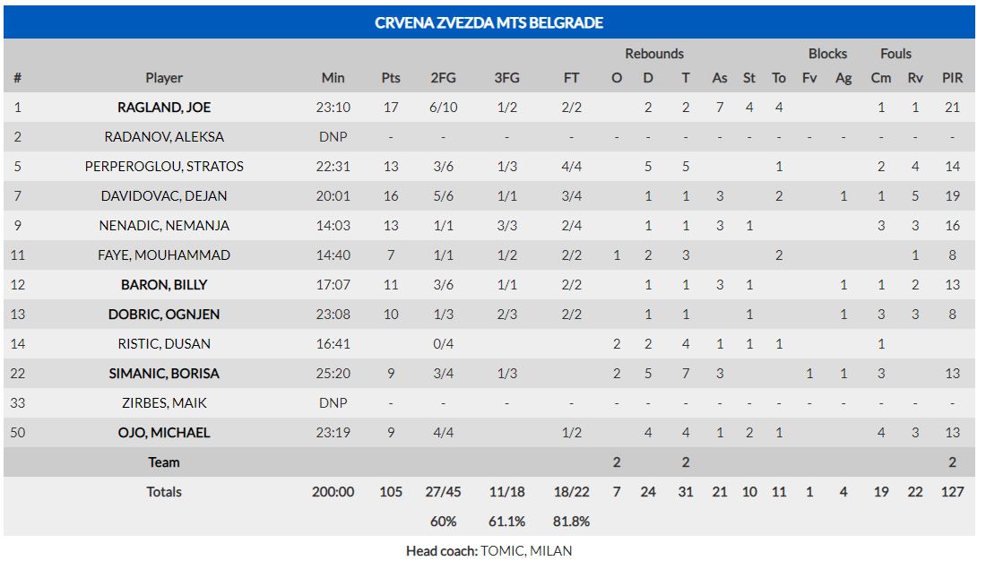 GRAN PARTIDO DE LOS MENOS HABITUALES DEL ESTRELLA ROJA: además de Ragland (17 puntos y 7 asistencias) y Perperoglou (13 puntos y 5 rebotes), destacaron en el conjunto serbio jugadores que no han tenido un gran protagonismo en esta Eurocup. Es el caso de Davidovac (16 puntos) y Nenadic (13), cuando ninguno de los dos superaba los 4 de media. Al final del partido el entrenador del Estrella Roja, Milan Tomic, se lamentaba de no haber ofrecido este nivel con anterioridad, y es que los serbios llegaron al último partido sin opciones de clasificarse.