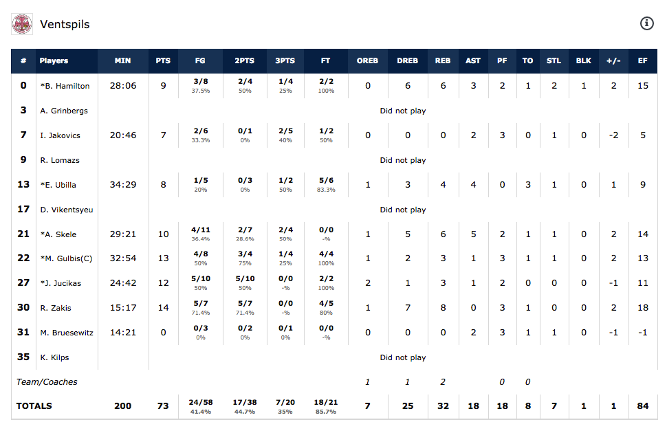 El conjunto canarista comienza con mal pie la nueva campaña europea tras caer en la cancha del Ventspils letón en un partido igualado hasta el final. Se antojaba complicada la travesía hasta Letonia para su debut en la BCL, y más aún conociendo la baja de Davin White (rotura abdominal) para los isleños. Desde que comenzase el encuentro se iría alternando el liderato entre ambos con un Mike Tobey excelso, que acabaría con 20 puntos y 6 rebotes, pero sería insuficiente. Llegados al final del último período, un tiro libre fallado por Tobey y dos triples errados por San Miguel y Richotti más una bandeja anotada por Zakis dejaban la victoria en la ciudad a orillas del Báltico.