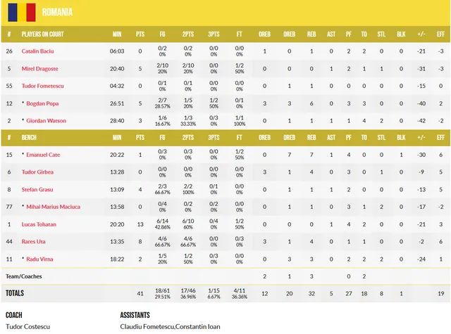 Pocos partidos tan malos en anotación acuden a la memoria si los comparamos con el que jugó hoy Rumanía. Superados completamente por la presión defensiva de España, que tampoco se esforzó al máximo, los de Cotescu apenas anotaron 41 puntos en todo el partido con 1/15 en triples y un acierto total de tiros de campo que no llegó al 30%. Lucas Tohatan (13) y Rares Uta (8) fueron los únicos que dieron la talla en ataque. Mal día en la oficina para los rumanos que se quedan fuera del Eurobasket con muy malas sensaciones.