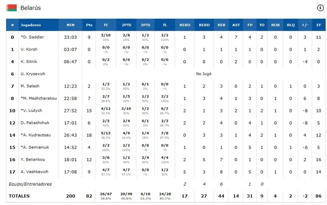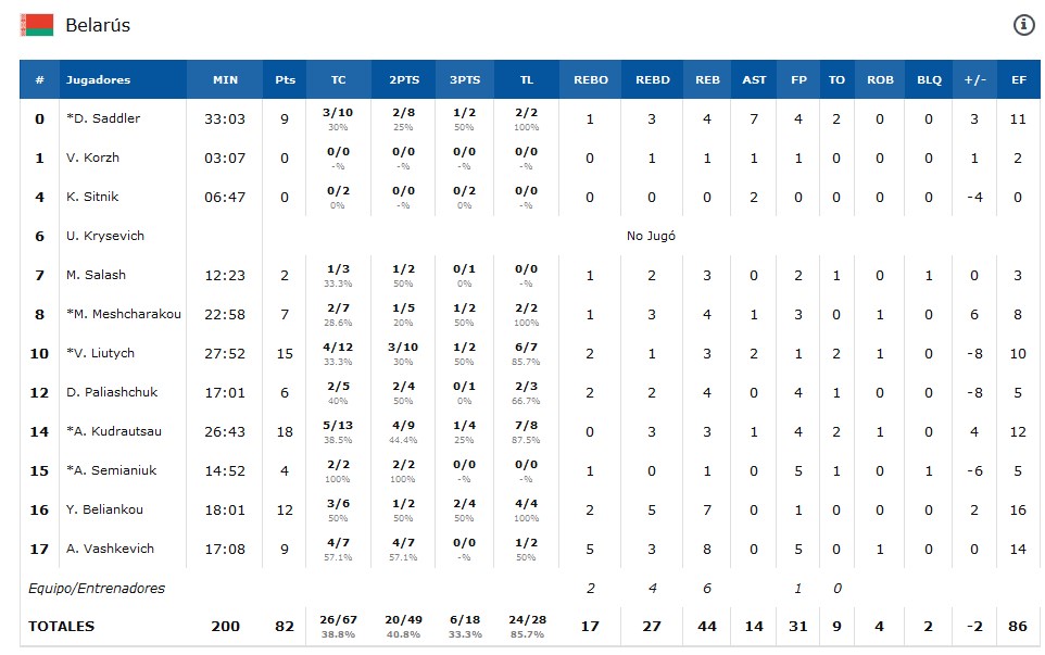 Una Bielorrusia desconocida no se rindió nunca y dominó el rebote ofensivo. El rival de nuestra selección en el día de hoy era uno de los más desconocidos a los que nos hemos enfrentado en los últimos tiempos. Pero al menos en el partido de hoy jugaron como un equipo y nunca dieron por perdido el partido. Después de una primera parte en la que parecía que solo Liutych con 13 puntos era su única arma, en la segunda aparecieron otros jugadores para acribillar la canasta española, con Kudrautsau y Beliankou como más destacados con 18 y 12 puntos al final del partido, pero también con apariciones destacadas de Saddler y Vashkevich. Además demostraron sus ganas y energía en la cancha con 17 rebotes ofensivos que hicieron mucho daño a la selección española.