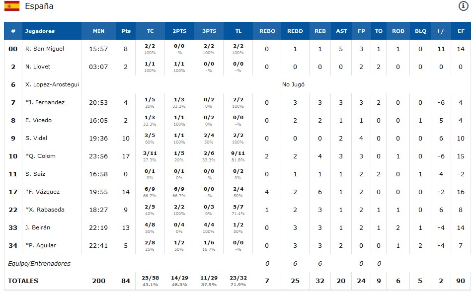 Los veteranos lideraron. Así como en los anteriores partidos habían destacado jóvenes como Paulí, Saiz y otros ya más rodados pero de corta edad como LLovet y Jaime, en el partido de hoy todo el peso lo llevaron los veteranos del equipo. Quino Colom se mantuvo como el líder ofensivo de este equipo, siendo otra vez el máximo anotador con 17 puntos, y Fran Vázquez ejerció otra vez de dominador de la pintura. Sergi Vidal y la pareja de Iberostar, San Miguel y Beirán, completaron el quinteto experto que estuvo a un gran nivel y, exceptuando la pájara final, los mejores momentos de los españoles fueron con varios de ellos en cancha. Todos superaron la decena en valoración, mostrando la experiencia de muchos años jugando al más alto nivel.