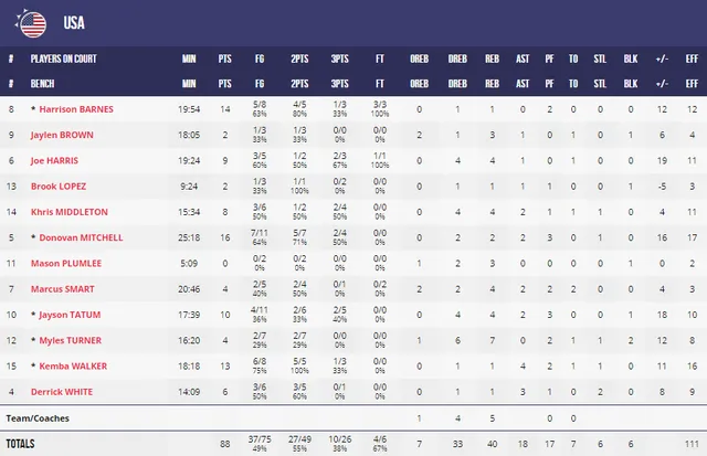 3. Mucho que mejorar. Aunque EEUU ha debutado con victoria, no lo ha hecho por muchos puntos como debería, solo por veinte puntos, y con solo 88 puntos anotados, con una pobre efectividad de 49 % en el tiro. Además, los de Popovich permitieron tiros fáciles a los checos desde el triple, en el que dominaron con un porcentaje del 44 %. El rebote defensivo también es una faceta en la que tienen que mejorar, con 29 – 33 final y que no pueden permitir al rival. También, no hubo ningún jugador que no superara los 20 puntos, y faltaron actuaciones de jugadores que apenas aparecieron.
