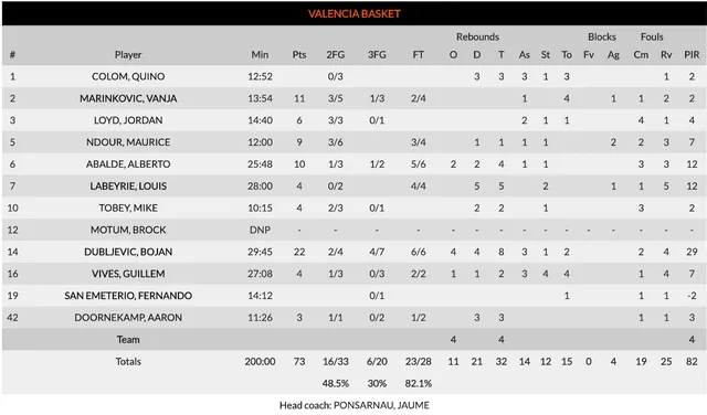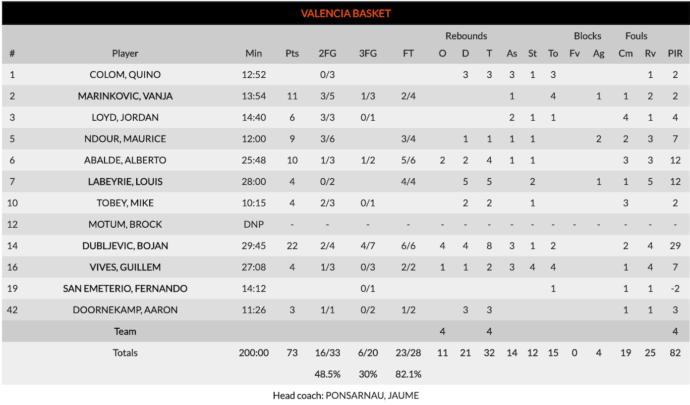 La vuelta a pista de Ojo benefició a Valencia, pues Dubljevic obligó al nigeriano a salir hasta siete metros lo cual facilitó la tarea a sus compañeros e hizo que el montenegrino encontrara un triple más que le hizo irse hata los 10 puntos al descanso. Para poner el 37-41 al descanso, Valencia sobrevive en un partido muy difícil con un ritmo lento y una gran defensa local y ambos equipos se citan par resolver la contienda en la segunda parte