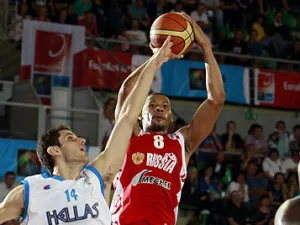 Comenzó el partido con un equipo ruso muy activo defensivamente, decidido a tratar de ganar el partido desde el primer momento. Así logró abrir ventaja en el marcador, con una gran defensa, superioridad interior y una gran actuación de Fridzon (8 puntos) y Monya (6 puntos), para acabar el periodo 12-21. El segundo periodo continuó con una dinámica similar, Rusia siempre por delante en el marcador administrando la diferencia frente a un equipo griego que se veía impotente, incapaz de reducir la distancia notablemente, al descanso 32-39 tras una canasta sobre la bocina de Ponkrashov.