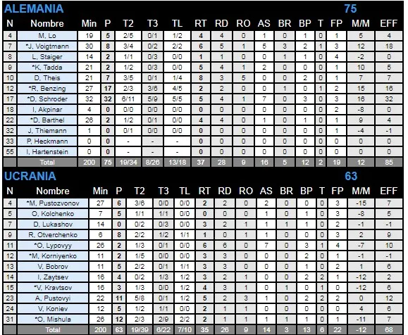 - Sin puntos no hay paraíso. Ucrania no tiene anotación entre sus jugadores. Plantaron cara en la primera parte gracias a una gran defensa y a una buena selección de tiro, pero en cuanto los alemanes se soltaron no pudieron seguir su ritmo anotador. Solo Mishula parecía con la capacidad y la actitud para jugarse tiros en acciones individuales, pero no estuvo acertado (2 de 9 en triples).
