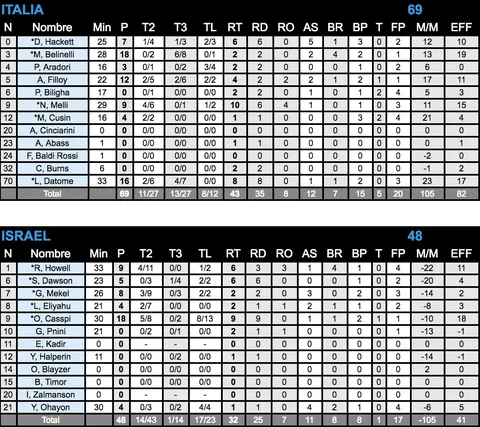 - El acierto de Italia; el desastre estadístico de Israel: pocos hubieran pensado antes de arrancar este partido que los israelíes tan solo anotaran 48 puntos, pero así ha sido. La defensa italiana ha sido muy buena, pero el desacierto de Israel ha condenado a una de las anfitriones: 1 de 14 y 7% de acierto en triples. Por su parte, Italia ha metido 13 triples para un 48%. La diferencia lo dice todo.