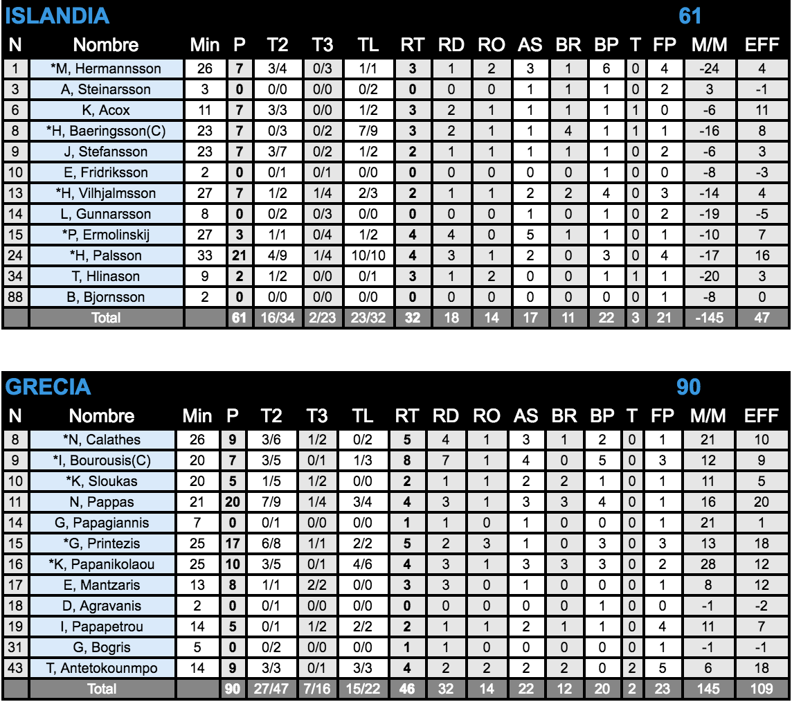El bloque griego acaba sentenciando: Desde el comienzo del partido el equipo heleno sabía que era una oportunidad única para conseguir buenas sensaciones y demostrar que pese a las bajas son uno de los equipos que mejor pueden llegar a jugar colectivamente (22 asistencias al final del encuentro). La sorpresa de Nikos Pappas con 20 puntos y el esperado rendimiento ofensivo con Georgios Printezis con 17 puntos, gracias a los buenos porcentajes de tiro (8/13 y 7/9 respectivamente). El factor Ioannis Bourousis, fue determinante para no permitir que los islandeses no pudieran llegar a ponerse por delante en el marcador a pesar del desacierto colectivo en momentos de la primera parte. Máximo reboteador del encuentro con 8 rebotes y máximo asistente de Grecia con 4 asistencias.