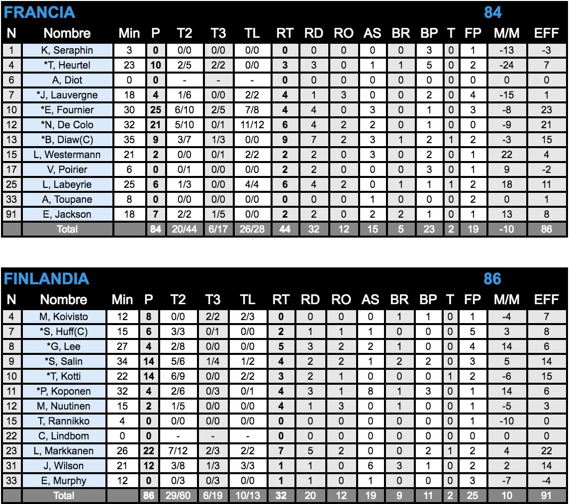 Sin noticias del juego interior francés: Tienen la excusa de las bajas, pero el nivel que ofreció el juego interior de los de Poirier estuvo muy lejos de lo que se espera. Solamente Diaw (9 puntos y 9 rebotes) se salvó en un día desastroso de jugadores clave como Lauvergne (1/6 en tiros de campo). Seraphin y Poirier ni siquiera entraron en dinámica del partido, con 3 y 6 minutos jugados cada uno. Al final, esa diferencia en el juego interior desequilibró el encuentro, dejó solos a los exteriores y, peor aún, permitieron que Markannen se desatase.