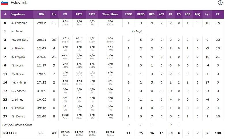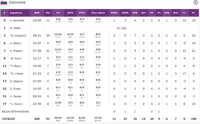 - El rúgido del Dragón: La actuación de Goran Dragic, mientras le duraron las fuerzas, agota todos los calificativos: 35 puntos con un 55% en tiros de campo, 7 rebotes, 3 asistencias y 2 robos para 33 de valoración en 28:52 minutos de juego. Es cierto que Eslovenia ganó el partido jugando sin él en los minutos decisivos ya que el cuerpo del base de los Heat no daba más, pero también lo es que si llegaron con ventaja es por su estratosférica actuación. Empezaron el tercer cuarto con 11 de ventaja gracias a los 20 puntos de su líder en el segundo, y cuando Doncic se lesionó, siguió anotando para que no bajara la moral de sus tropas. Cuando ya no pudo más, los suyos ya creían en la victoria porque él les mostró el camino.