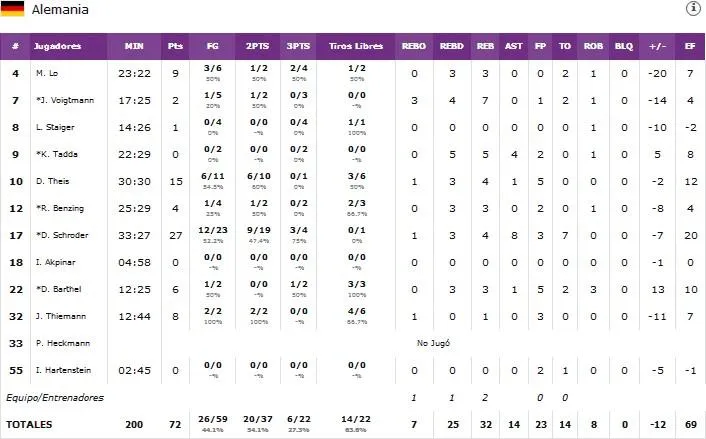 - El talento de Schroder, insuficiente. Era la gran amenaza del combinado germano y no falló a la cita. El jugador de los Atlanta Hawks ofreció una enorme variedad de recursos técnicos y lideró a los suyos con 27 puntos, 4 rebotes, 8 asistencias y 20 de valoración a pesar de la excelente defensa de Joan Sastre durante varias fases del encuentro. Su gran actuación, sin embargo, quedó estéril al caer eliminados en la antesala de la lucha por las medallas. El único compañero que terminó con dobles figuras en lo que a anotación se refiere fue Daniel Theis (15).