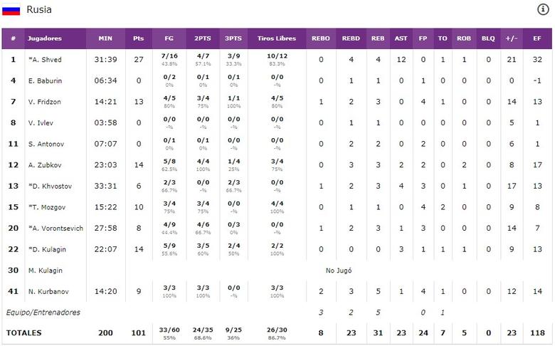 - Rusia es un equipo muy duro y muy bien organizado: Shved no ganó solo el partido. La defensa de todos sus compañeros fue de libro y en ataque aprovecharon muy bien todo el juego que generó su número 1. Mozgov cumpió en la zona como siempre, Zubkov fue el jugador sorpresa con 14 puntos, Kulagin aportó otros 14 con grandes porcentajes y Fridzon (13 puntos) sostuvo al equipo cuando Alexey descansó en la primera parte. Pero es que también Khvostov, Vorontsevich y sobre todo Kurbanov hicieron un gran trabajo.