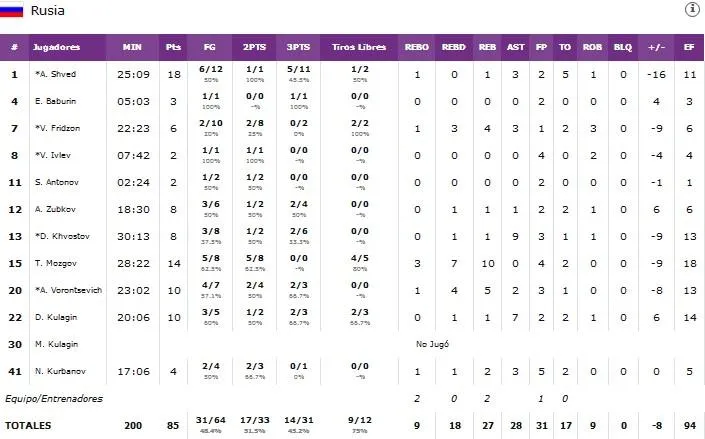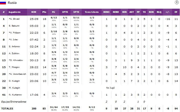 Shved y compañía. La gran estrella de Rusia terminó el partido con 18 puntos y un 5/11 en triples aunque llamó especialmente la atención el hecho de que el seleccionador ruso le dejara sentado durante prácticamente todo el último cuarto en una clara apuesta por dar protagonismo a los jugadores que tan buen rendimiento ofrecieron en el intento de remontada: Mozgov, Vorontsevich y Kulagin entre otros. Shved volvió a 2:13 para finalizar el encuentro pero el todo o nada del técnico Bazarevich salió cruz.