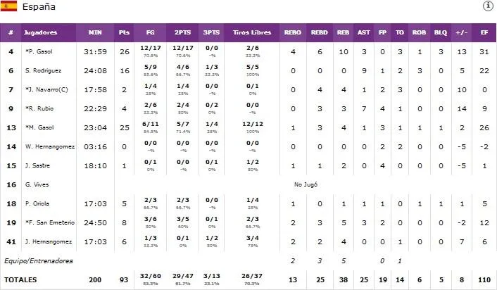 Superioridad en la pintura. El ya conocido como 'territorio Gasol' fue la principal arma de la selección española para abrir brecha en el marcador desde los minutos iniciales. Marc se arrancó con 10 puntos en los primeros ocho minutos hasta que tuvo que retirarse lesionado, Pau se fue hasta los 12 en el segundo cuarto, Marc sumó 11 en el tercer período y Pau de nuevo 12 en el definitivo. Ambos hermanos se combinaron para 51 puntos, 14 rebotes, 4 asistencias, 4 tapones y 57 de valoración.