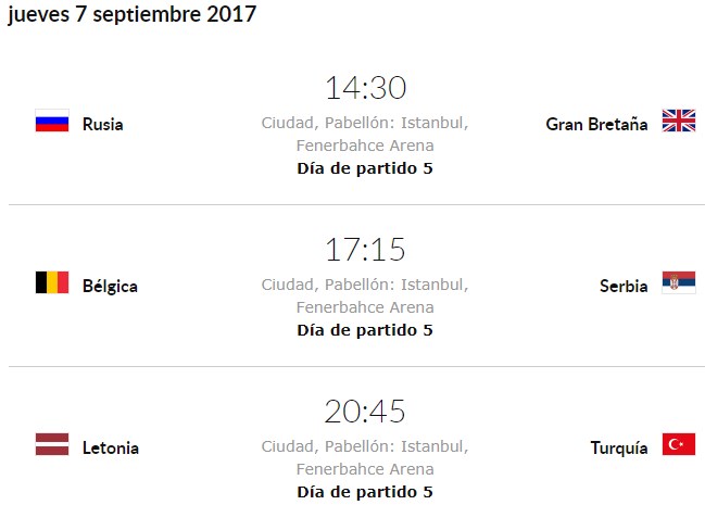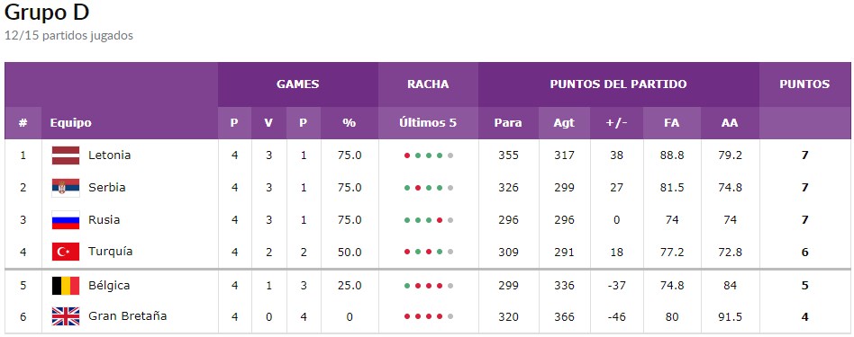 Letonia encadena tres victorias. Después de perder en el debut contra Serbia, los letones se han puesto como líderes del grupo gracias a su victoria contra la hasta ahora invicta Rusia. Y eso sin contar con un buen Porzingis, que de momento está pinchando contra los rivales con pívots de entidad. Serbia ha ganado con comodidad a una Gran Bretaña que no sabe lo que es la victoria a falta de una jornada. Turquía certifica su clasificación al vencer en el duelo directo a Bélgica. Solo queda por saber el orden, puesto que Gran Bretaña y Bélgica ya han quedado eliminadas.