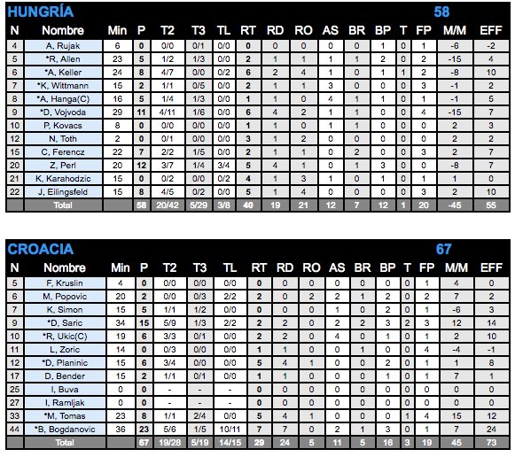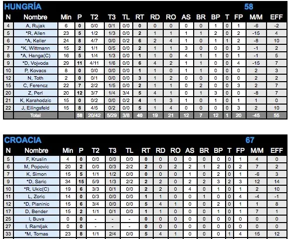 - Croacia impone el juego defensivo en el último cuarto: Después de que ambos equipos se fueran por encima de los 35 puntos al descanso, Hungría mantenía el ritmo ofensivo mientras que Croacia realizaba su peor cuarto anotador con 13 puntos. Los croatas reaccionaban de cara al último término del partido, apostando por las grandes defensas colectivas y un pequeño aumento en la anotación. En el último cuarto los húngaros no supieron reaccionar y un cuarto de 5-15 dejaba el 58-67 en el marcador.