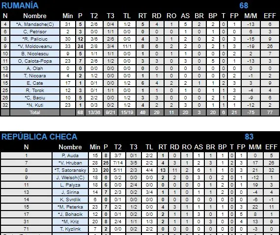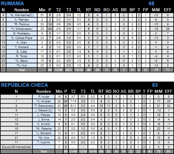 - Moldoveanu y 11 más: es la estrella, pero siempre ocurre lo mismo, que está demasiado solo. Ninguno de sus compañeros ha superado los 9 de valoración y él ha tratado de mantener la ilusión al público de Cluj-Napoca. Lo ha logrado durante dos cuartos, en los que ha sido el referente -cómo no- de una selección que, con el apoyo incondicional de la grada, se veía compitiendo en la jornada inaugural. El interior rumano ha seguido intentándolo, pero su equipo ha ido perdiendo fuelle y han acusado demasiado el mal tercer cuarto (9-22 favorable a los checos). Ha finalizado el encuentro con 24 puntos, 8 rebotes y 26 de valoración.