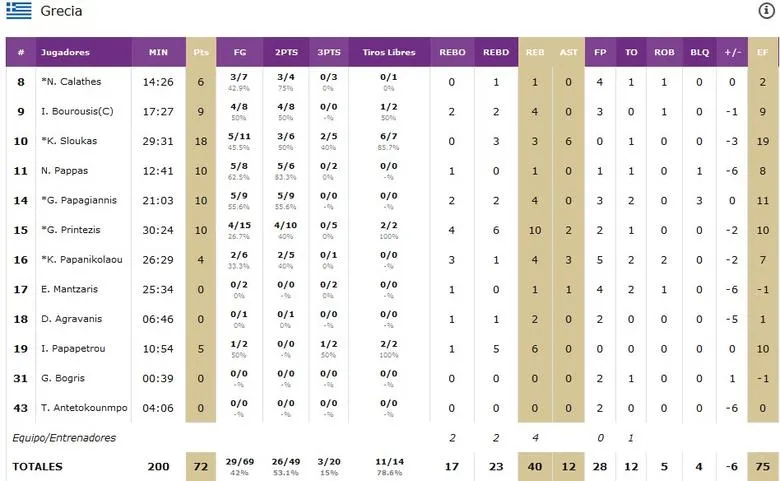 Grecia, sin acierto exterior: El conjunto heleno no encontró el equilibrio necesario en su juego. El pobre 15% en triples lo intentó compensar con una mayor eficacia cerca del aro. Papagiannis y Borousis buscaban hacer daño desde la pintura, mientras que los exteriores también buscaban el acierto en forma de penetraciones ante el desacierto exterior. Entre Calathes, Printezis, Pappas y Mantzaris sumaban un 0 de 12 en triples. Un lastre demasiado pesado ante la competitiva selección eslovena.