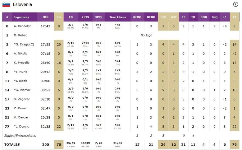 Luka Doncic, diferencial: El madridista se reivindicó como pieza determinante en el triunfo de su selección. Junto a Goran Dragic forman una de las parejas más determinantes del torneo. Doncic (22 puntos, 5 rebotes, 3 asistencias) tuvo relevancia en momentos clave del partido. Un triple suyo elevaba la ventaja hasta los 10 tantos en el primer periodo, mientras que un mate a falta de cuatro minutos para el final de partido consumaba la remontada eslovena igualando el encuentro a 66.