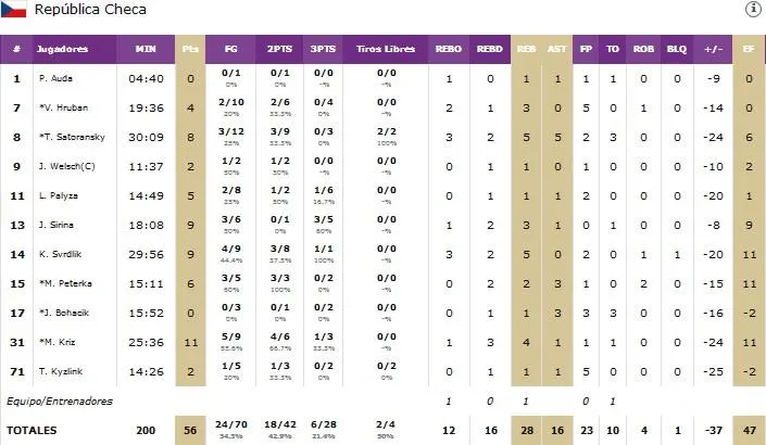 - Los checos, muy mermados. A las conocidas bajas para el Eurobasket de viejos conocidos como Jelinek, Vesely o Balvin, se unió al poco tiempo de arrancar el choque la de Patrick Auda por lesión. Tomas Satoransky sumó en todas las facetas del juego (8+5+5), Martin Kriz aportó 11 puntos y Jacub Sirina encestó 3 triples, pero su actuación fue insuficiente para plantar cara al combinado español.