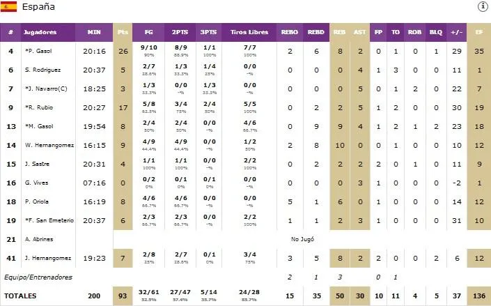 - Todos suman y Pau lidera. Da igual quién sea titular y quién suplente. Todos y cada uno de los jugadores de la selección española dieron lo mejor de sí en los minutos que estuvieron sobre el parqué y Pau Gasol terminó como máximo anotador con 26 puntos y 35 de valoración… en 20 minutos. Guillem Vives fue el único que no vio aro en los 7 minutos que disputó pero todos los integrantes del equipo consiguieron terminar con valoración positiva y repartieron, nada más y nada menos, 30 asistencias.