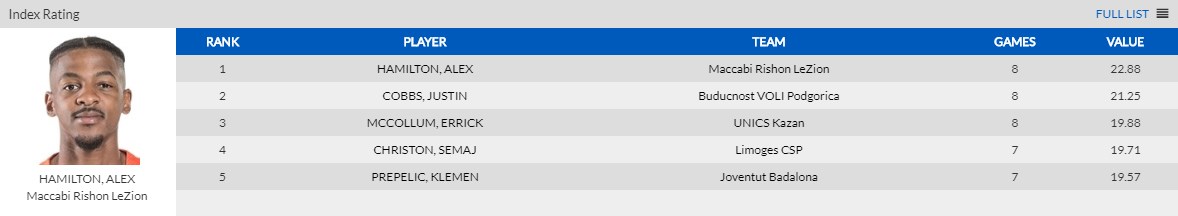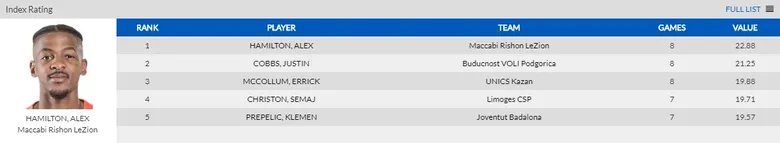 -Alex Hamilton (Maccabi Rishon LeZion) : 22’9 de valoración, 17’3 puntos, 4’1 rebotes, 5’4 asistencias y 2 robos