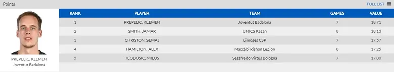 -Klemen Prepelic (Joventut Badalona) : 19’6 de valoración, 18’7 puntos, 2’9 rebotes, 4’4 asistencias y 1’1 robos