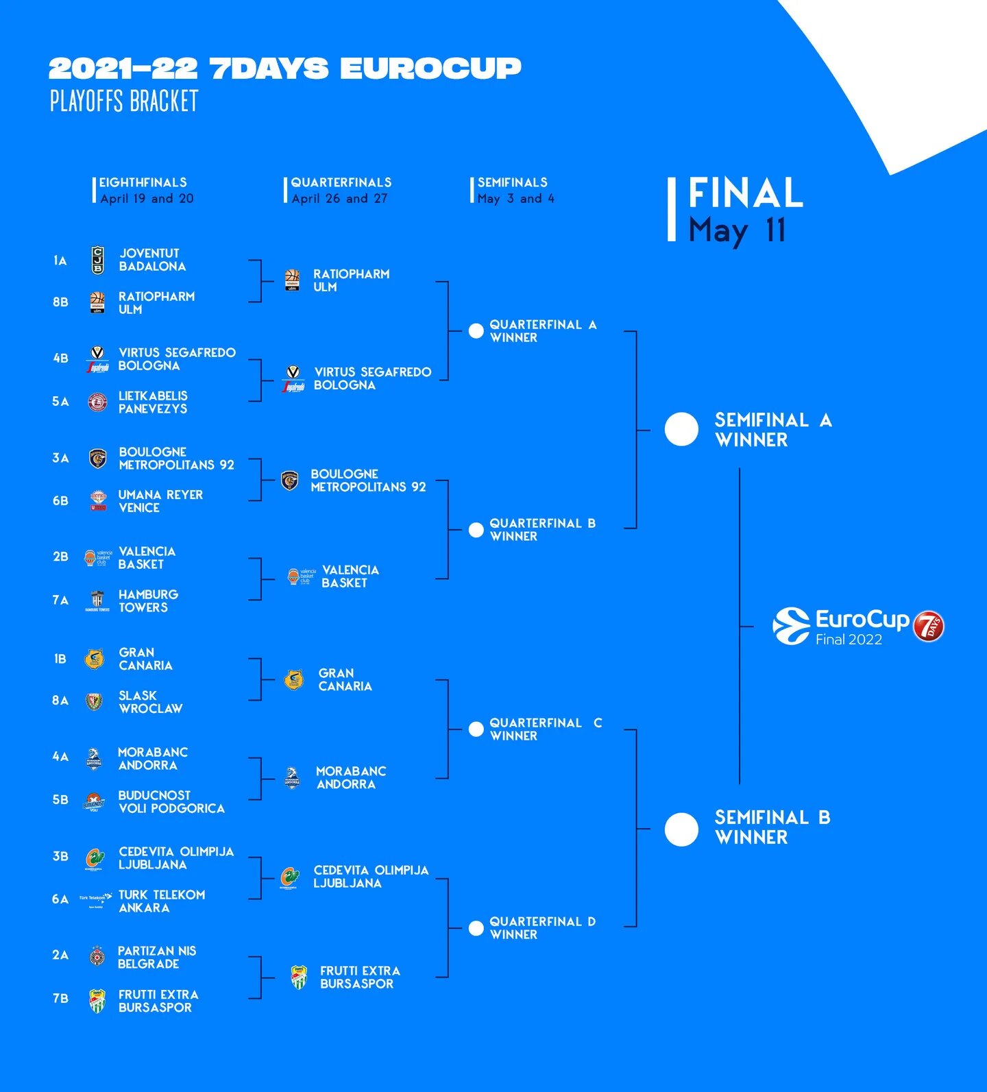 Este martes comienzan los cuartos de final de EuroCup y que decidirá los cuatro equipos que disputarán las semifinales de la segunda competición del baloncesto europeo. En esta ronda, se enfrentan dos equipos de la Liga ACB, Gran Canaria vs MoraBanc Andorra y por lo que seguro habrá un representante de la liga española en semifinales. El otro equipo de ACB que tiene opciones de pasar a la siguiente ronda es Valencia Basket, que se verá las caras ante Boulogne Metropolitans 92 en Valencia.
