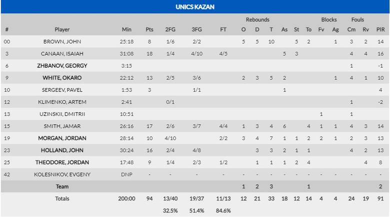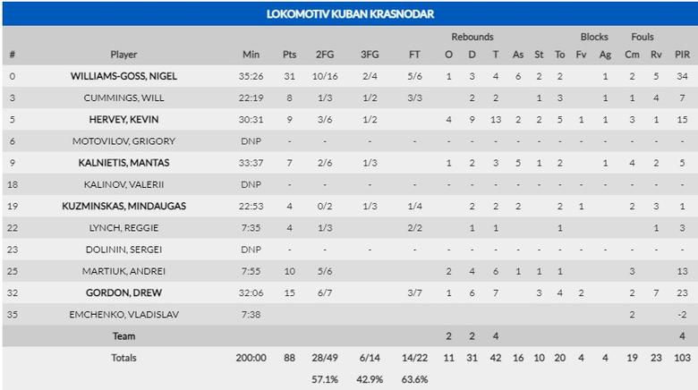 Williams-Goss fue el mejor jugador estadísticamente hablando con 31 puntos, 4 rebotes, 6 asistencias, 2 robos y 34 de valoración, pero, aunque demostró que debería seguir siendo un jugador de Euroliga, en el último cuarto no consiguió ser importante al anotar tan solo 4 puntos. La réplica a los puntos del ex de Olympiacos y Partizan la dieron entre el dúo formado por Canaan y Jamar Smith, turnándose a la hora de ejercer el protagonismo y sumando 35 puntos y 30 de valoración. Por Lokomotiv se echaron en falta los puntos de la pareja lituana formada por Kalnietis y Kuzminskas, que realizaron un partido muy pobre, mientras aguantaban gracias a su dúo interior formado por Hervey y Gordon, mientras que los de Priftis si contaban con el gran trabajo de John Holland y Jordan Morgan, más algunos destellos de Jordan Theodore.
