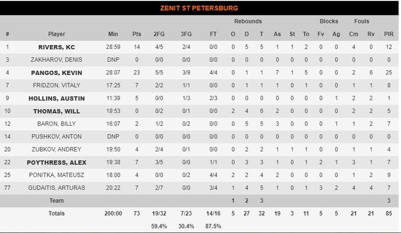 El Zenit de Xavi Pascual también ha fichado a grandes anotadores, pero hoy solo KC Rivers y Kevin Pangos demostraron esa capacidad. El base canadiense que no consiguió brillar en el Barça fue el protagonista de la victoria rusa. Sus números fueron de 23 puntos, 7 asistencias y 25 de valoración, cerrando el duelo con cuatro tiros libres decisivos sin fallo. El partido fue espeso y con muy poco acierto de ambos conjuntos desde la línea de tres, pero el Zenit fue mejor en el último cuarto y en los momentos decisivos y se llevó una victoria muy valiosa para ellos.