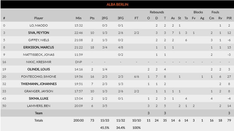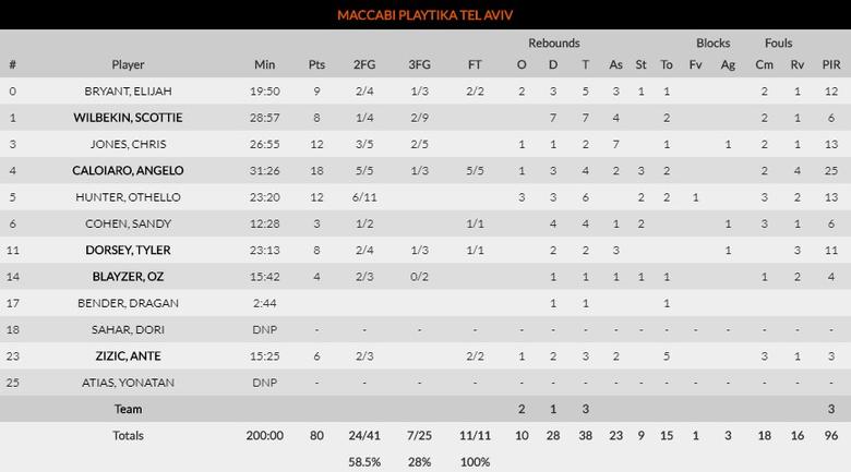 Los israelís fueron el primer favorito que cumplió con su papel en el estreno de la competición. El ALBA de Aíto volvió a mostrar momentos de gran juego como su primer cuarto donde se adelantó 19 a 29, pero no fue capaz de mantener ese nivel ofensivo cuando los de Sfairopoulos apretaron en defensa. Peyton Siva y Eriksson estuvieron a buen nivel, pero hay que destacar el buen debut de Ben Lammers en la competición y el nuevo descubrimiento de Aíto en la figura de un Simone Fontecchio que se fue hasta 27 de valoración. Pero enfrente tuvieron un rival muy bien armado con hasta cinco jugadores en dobles dígitos de valoración, liderados por Angelo Caloiaro con 25. Buen debut de Chris Jones, pero muy flojo de Ante Zizic e irrelevante de Dragan Bender.