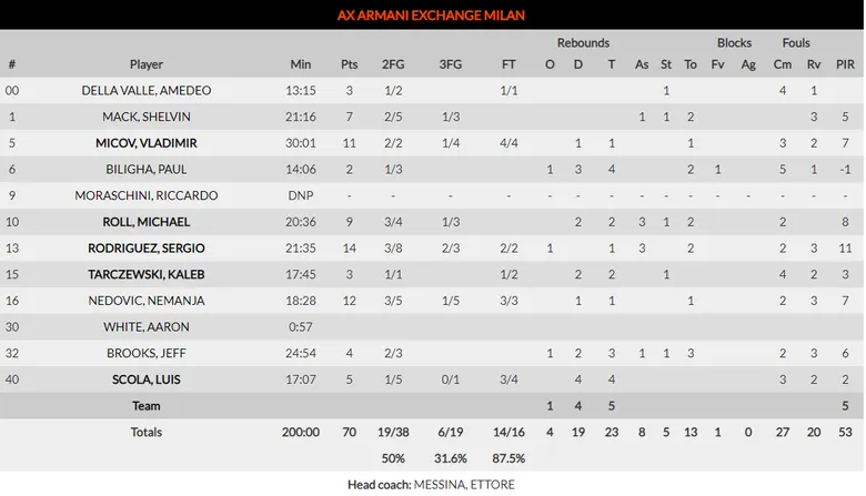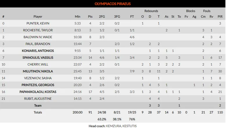 El conjunto griego doblega al Armani Milán de Sergio Rodríguez y consigue sumar su quinta victoria al casillero. En un partido ampliamente dominado por el rebote griego (37 a 23), los de Kezmura rompieron el partido en el tercer cuarto con un parcial de 31-16. El jugador más valorado fue Nikola Milutinov con un doble-doble de 13 puntos, 11 rebotes y 7 faltas recibidas para 30 de valoración.