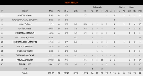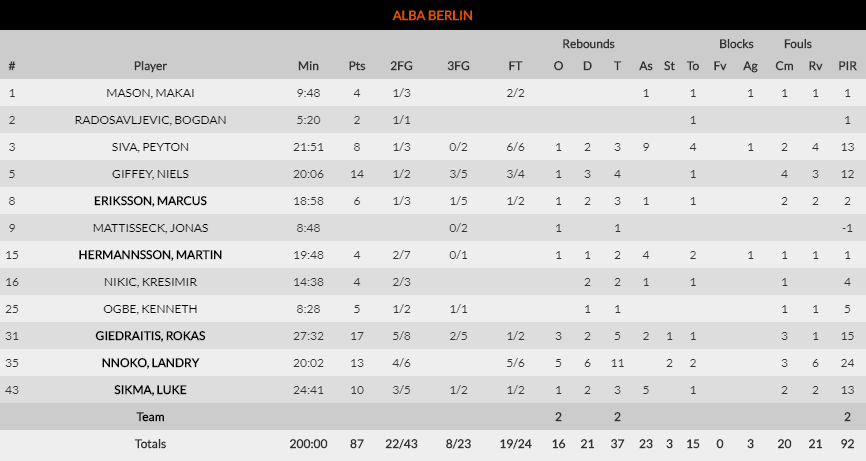 El Alba de Berlín comenzó la temporada con un doloroso 1-6 en victorias y derrotas en sus primeros 7 partidos, comenzó a recuperarse con un 3 victorias en los siguientes 4 partidos, pero esta semana ha vuelto a encadenar derrotas de manera consecutiva. Cayendo, abultadamente, ante el Khimki de Shved, Booker y Jerebko -64 puntos combinados-. Un equipo que cada vez apunta más alto, y en la jornada de esta semana lo ha demostrado. +23 puntos de diferencia combinados entre el 3º y el 4º cuarto, y una lectura muy buena de la debilidad de su rival. Y es que anotaron 28 canastas de 2 -6 más que su rival con un 67% de acierto-, repartieron 24 asistencias y, además, robaron 10 balones, provocando un total de 15 pérdidas en sus contrincantes. Un Alba del que se salvan, por así decirlo, Rokas Giedraitis y Niels Giffey, además de Peyton Siva -9 asistencias, pero 4 pérdidas-.