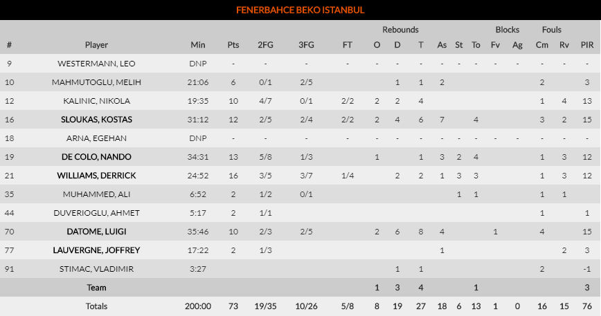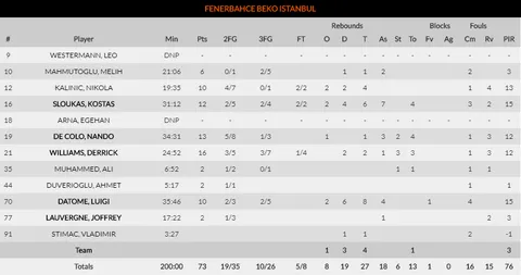 La temporada de Fenerbahce, hasta el momento, es para olvidar. Son el 3º equipo que más puntos en contra ha encajado en lo que va de Euroliga, se encuentran en la medianía del 13º puesto -el año pasado fueron el mejor equipo de la competición- y aunque en la Super Liga turca llevan 9 victorias en 11 partidos, son 3º tras Anadolu y el Pinar Karsiyaka. Por ello, debería haberse evitado el dejar escapar el partido, y a su rival, por un parcial de 2-12 en el 3º periodo. Pero ha sucedido de todas formas. Y es que Williams, De Colo, Sloukas y Datome están muy sólos. Entre los 4 produjeron 51 de los 73 puntos, con la aportación de los 10 tantos de Kalinic como lo único salvable de un banquillo que, sin contar a Nikola, anotó 10 puntos en 4 tiros. Por parte de Efes, Shane Larkin estuvo errado desde el triple pero lo compensó desde la personal -11 de 12- y Simon Krunoslav fue la gran cara destacada de su equipo, con un partido muy completo, llegando a los 22 puntos, 9 rebotes y 4 asistencias.