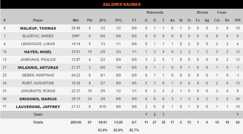 Marius Grigonis volvió a ser el líder de Zalgiris con 24 puntos, 6 rebotes, 3 asistencias y 24 de valoración, pero tuvo bastantes compañeros haciendo un buen trabajo. Walkup dirigió bien con 8 asistencias, Hayes y Jokubaitis anotaron, mientras que Rubit y Lauvergne hicieron un buen trabajo en la zona. Papagiannis, Papapetrou y Nedovic fueron los mejores por los griegos, pero el serbio no tuvo la chispa de otros días y que tanto necesita su equipo.