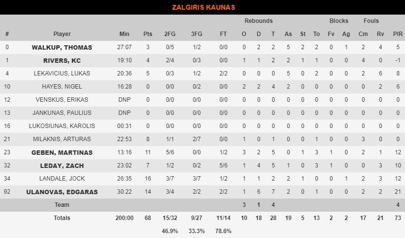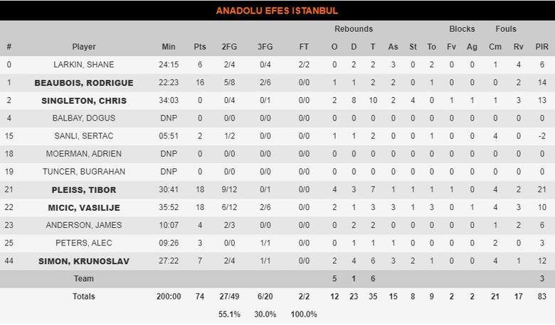 Tras un primer cuarto en el que los de Ataman parecían seguir a su ritmo arrollador (26-17), los de Jasikevicius consiguieron colapsar el ataque turco, pero aún así Anadolu se mantendrá líder tras esta jornada al sacar una victoria con mucho oficio. Por una vez ni Larkin ni Micic brillaron a su nivel habitual, aunque el serbio fue importante en el último cuarto con 9 puntos, pero Tibor Pleiss destacó con 18 puntos y 21 de valoración. Singleton dominó el rebote, Beaubois tomó protagonismo ante el flojo partido de Larkin y Simon aportó en varias facetas. Todo esto convirtió en inservible el buen partido de Ulanovas, Landale y Geben.