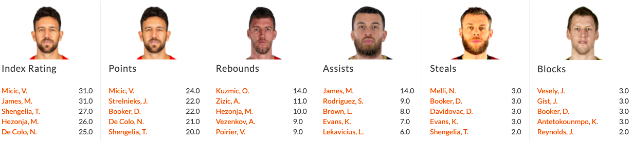 Que el UNICS empatara su récord de triples en un partido, con 15, evidencia la facilidad de cara al aro que tuvieron en el encuentro. Mario Hezonja fue el líder del cuadro ganador con su primer doble-doble en Euroliga (18 puntos y 10 rebotes). Isaiah Canaan y OJ Mayo fueron los francotiradores del equipo con 4 triples cada uno y unos 16 y 14 tantos cada uno. El único en rendir por parte del CSKA fue Tornike Shengelia, con 20 puntos.