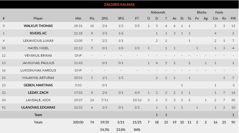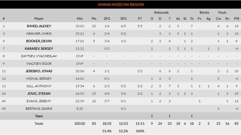 Alexey Shved estuvo más comedido esta vez y compartió protagonismo ofensivo con Stefan Jovic. Ambos sumaron los mismos puntos para aportar 50 de los 83 de su equipo. El base serbio jugó uno de sus mejores partidos con la camiseta de Khimki para acabar con 29 de valoración. Los rusos no jugaron su partido más brillante pero estuvieron más sobrios para no permitir una remontada como la que sufrieron contra Olympiacos en el otro partido de esta jornada doble. El Zalgiris de Jasikevicius sigue sin ser capaz de ganar partidos aunque compite y lleva ya nueve derrotas seguidas, quedándose como colista en solitario. Jock Landale realizó un gran partido con 30 de valoración pero estuvo muy solo por los lituanos.