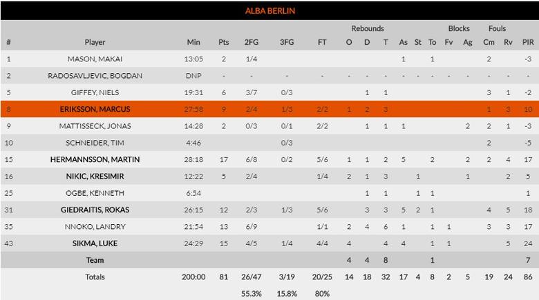 El partido se decidió en un tercer cuarto en el que los franceses se impusieron tanto en defensa como en ataque con un parcial de 31 a 14. Ambos equipos destacaron por un juego coral con hasta cinco jugadores por bando superando la decena en valoración. La vuelta de Adreian Payne fue muy positiva para los locales, como demuestran sus 12 puntos y 16 de valoración en 17 minutos. Por los alemanes brillaron Sikma, Giedraitis, Hermannsson y Nnoko, pero echaron en falta a Peyton Siva.