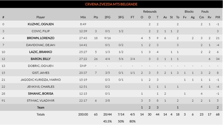 Estrella Roja se impuso al Zenit en un partido de muy poca calidad ofensiva gracias a que tuvo a los dos únicos jugadores que mostraron un alto nivel en este partido. Lorenzo Brown sigue demostrando que es uno de las estrellas de esta competición mientras que el ex de UCAM Murcia Billy Baron realizó su mejor partido en Euroliga. Entre ambos sumaron 44 puntos y 55 de valoración de los 65 y 68 de su equipo. Un horrible tercer cuarto con tan solo 7 puntos condenó a los de Plaza, entre los que solo Hollins y Thomas superaron la decena en anotación. Aún así los rusos estuvieron en el partido hasta el final y un intento triple de Hollins a falta de 45 segundos pudo haberlos puesto a un punto, pero no entró y Baron ajustición en el siguiente ataque. Vladimir Stimac debutó con los serbios.