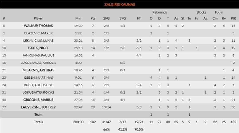 Zalgiris es todo lo contrario. Con una plantilla mucho más modesta y un presupuesto sensiblemente inferior está realizando una temporada muy destacada. Hoy aprovecharon la debilidad de su rival para lucirse, especialmente Joffrey Lauvergne, que sumó 29 puntos con solo un fallo en el tiro (13/14), 9 rebotes y 38 de valoración.