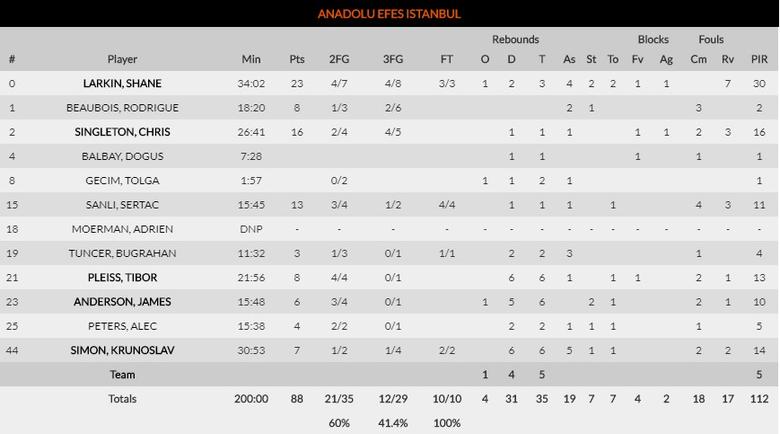 Nueva victoria de los de Ataman y nueva exhibición de Shane Larkin, que esta vez se ha ido a 30 de valoración. También como siempre gran trabajo coral, con muchos jugadores aportando. Concretamente hasta cinco más superaron la decena en valoración, con un Singleton en plan francotirador y Simon ejerciendo de todoterreno. El primer cuarto fue igualado, pero como otras veces Anadolu ya puso la directa en el segundo, mostrando su gran capacidad ofensiva (26 a 18). En los dos últimos cuartos mostró una gran regularidad anotando 23 en cada uno, mientras que los de Messina realizaban un mal partido con Sergio Rodríguez y Scola desaparecidos. Solo Gudaitis y Roll tuvieron una buena actuación y eso es muy poco para inquietar a este intratable Anadolu.