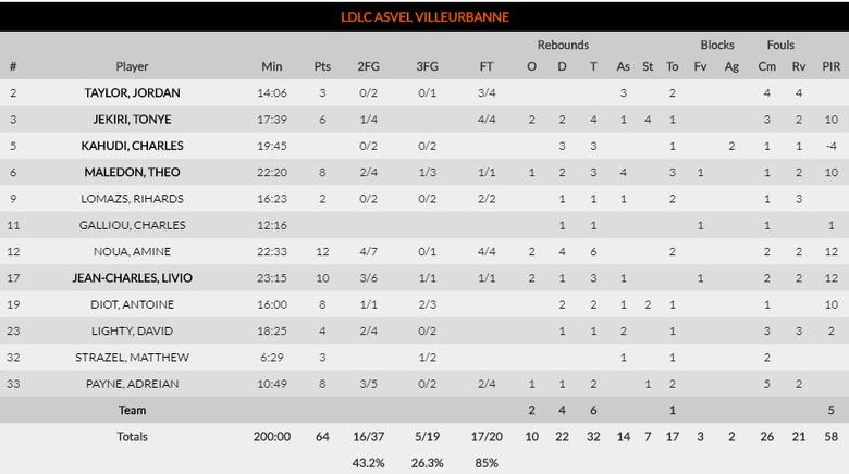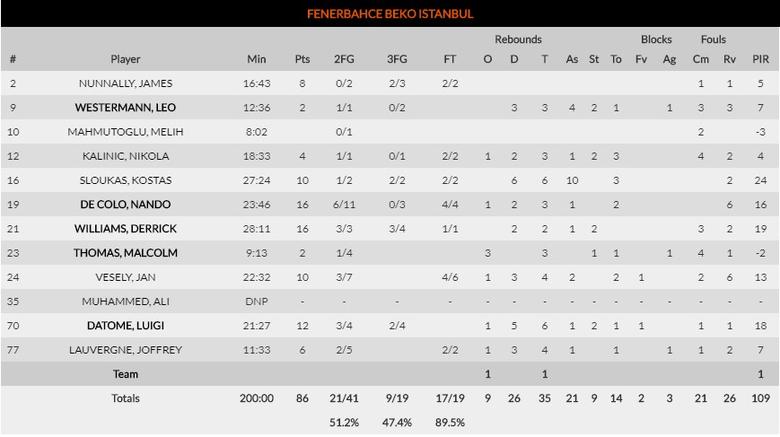 Tercera victoria de los de Obradovic, que ya tienen las plazas de playoff a la vista. Los turcos dominaron de principio a fin a un Villerbaunne muy poco acertado, como demuestra su 5 de 19 en triples y que Noua fue su máximo anotador con 12 puntos. Fenerbahce anotó cuatro triples más con los mismos intentos y encontró un quinteto que le dió un gran rendimiento. Sloukas fue el mejor con un doble doble de 10 puntos y 10 asistencias, más 6 rebotes para 24 de valoración. Datome, Williams, De Colo y Vesely fueron los otros integrantes, valorando todos por encima de la docena. Nunnally anotó sus primeros puntos en esta vuelta al equipo turco con dos triples para un total de 8 puntos.